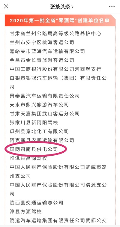 國網張掖肅南縣供電公司榮獲2020年甘肅省第一批“零酒駕”創(chuàng)建單位