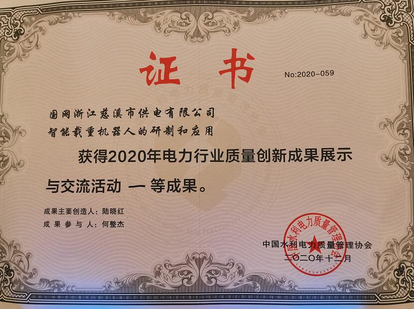 國(guó)網(wǎng)慈溪市供電公司智能機(jī)器人榮獲全國(guó)電力行業(yè)質(zhì)量創(chuàng)新成果一等獎(jiǎng)