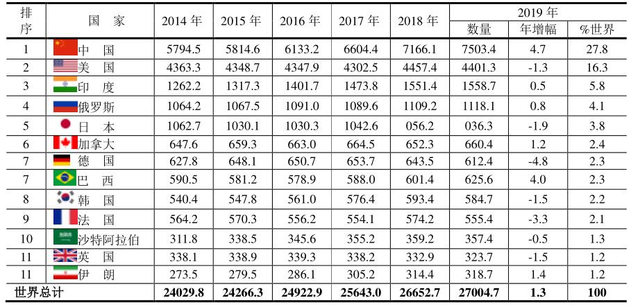 2014~2019年主要國家的電力生產(chǎn)量(單位:TWh)