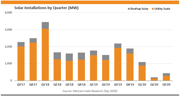 隨著疫情導(dǎo)致的全國(guó)范圍封鎖開始逐漸放寬,印度經(jīng)濟(jì)也開始緩慢復(fù)蘇。太陽能行業(yè)也因此受到積極的影響,三季度裝機(jī)容量明顯好于上一季度。但是,該行業(yè)仍然有很長(zhǎng)的路要走,四季度的部分項(xiàng)目調(diào)試日期已被批準(zhǔn)延期至2021年上半年。