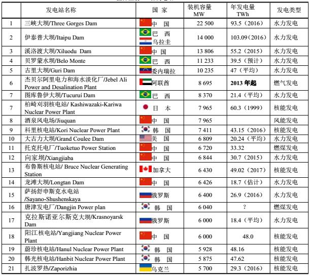 目前全球21席中,中國占有7席:水力發(fā)電占有4席:三峽大壩、溪洛渡大壩、向家壩和龍灘大壩;燃煤發(fā)電占一席:托克托電廠;核能發(fā)電占一席:陽江核電站;風電場占一席:酒泉風電場。