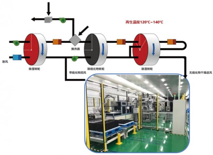 適合于大風量并且相對節(jié)能的固態(tài)電池工廠,再生溫度比單轉(zhuǎn)輪低,120-140℃,再生風量小,為處理風量1/10,運行能耗比單轉(zhuǎn)輪低。但是除濕機體積比單轉(zhuǎn)輪除濕機要大,應用范圍相對固定化。