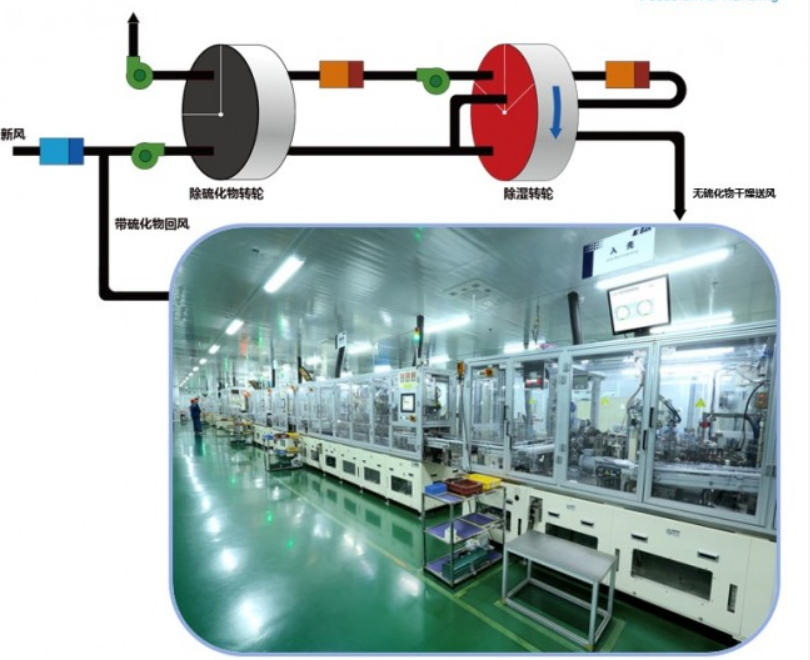 生產(chǎn)車間中濃度較低的H?S 氣體,會被除濕系統(tǒng)的負壓回風帶入除濕機內(nèi)部。該除濕機裝有活性炭過濾器/除硫轉(zhuǎn)輪,可先吸附硫化氫,再進行除濕。